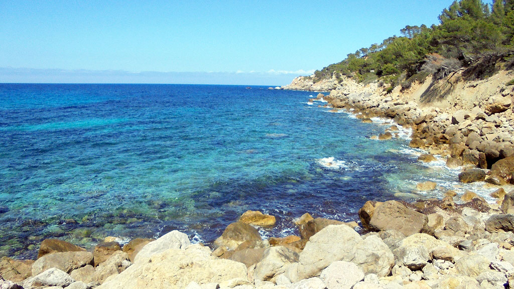 Ara ens falta caminar per les roques (ja que no trobam cap sendera) uns 200 metres fins a arribar a la Cala de Ses Ortigues, per agafar després el camí que puja cap a la carretera.